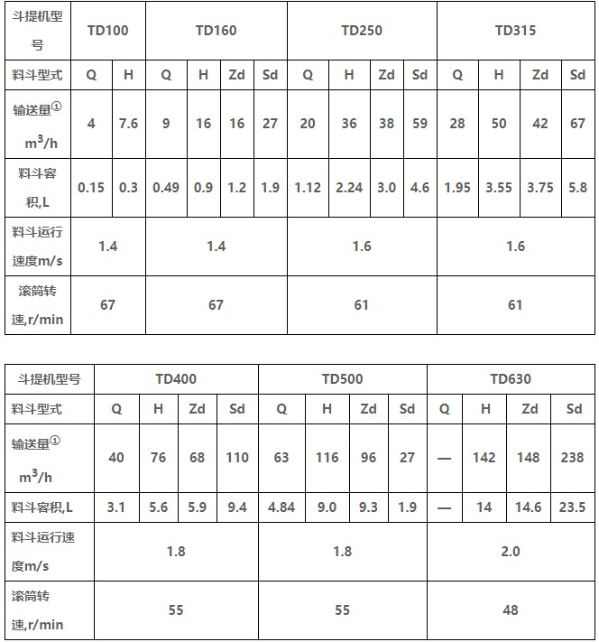 TD型垂直斗式提升機由運行部分(料斗與牽引膠帶)、帶有傳動滾筒的上部區段、帶有拉緊滾筒的下部區段、中間機殼、驅動裝置、逆止制動裝置等組成,適用于向上輸送松散密度ρ<1.5t/m3粉狀、粒狀和小塊狀的無磨琢性和半磨琢性散狀物料,如煤、砂、焦末、水泥、碎礦石等。本機的特點為快速離心卸料:并采用橡膠輸送帶為牽引構件,故不適于輸送大塊磨琢性及掏取阻力大的物料。被輸送物料的溫度不得超過60℃,如采用耐熱橡膠帶時溫度不超過200℃。與D型斗式提升機相比,具有輸送效率高,料斗型式多等特點。