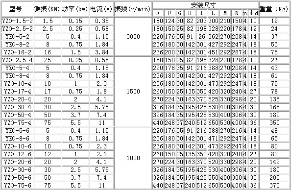 YZO系列振動電機技術參數
